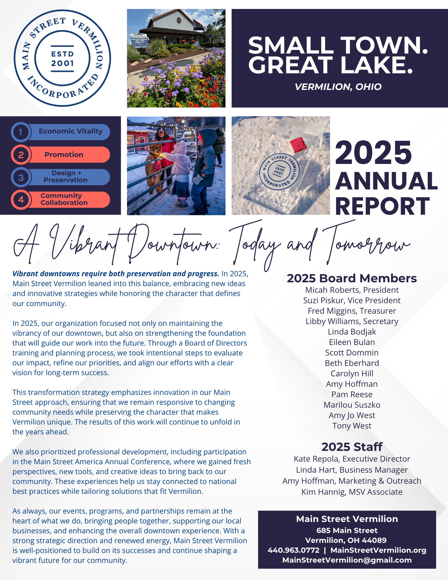 That’s the work of Main Street Vermilion and our partner programs: Vermilion in Bloom, Public Art Vermilion and Vermilion Arts Guild. It’s all of this plus our events and projects that make Vermilion a source of pride for our residents and a welcome destination for our visitors. We work every day to revitalize our community and we think it shows!