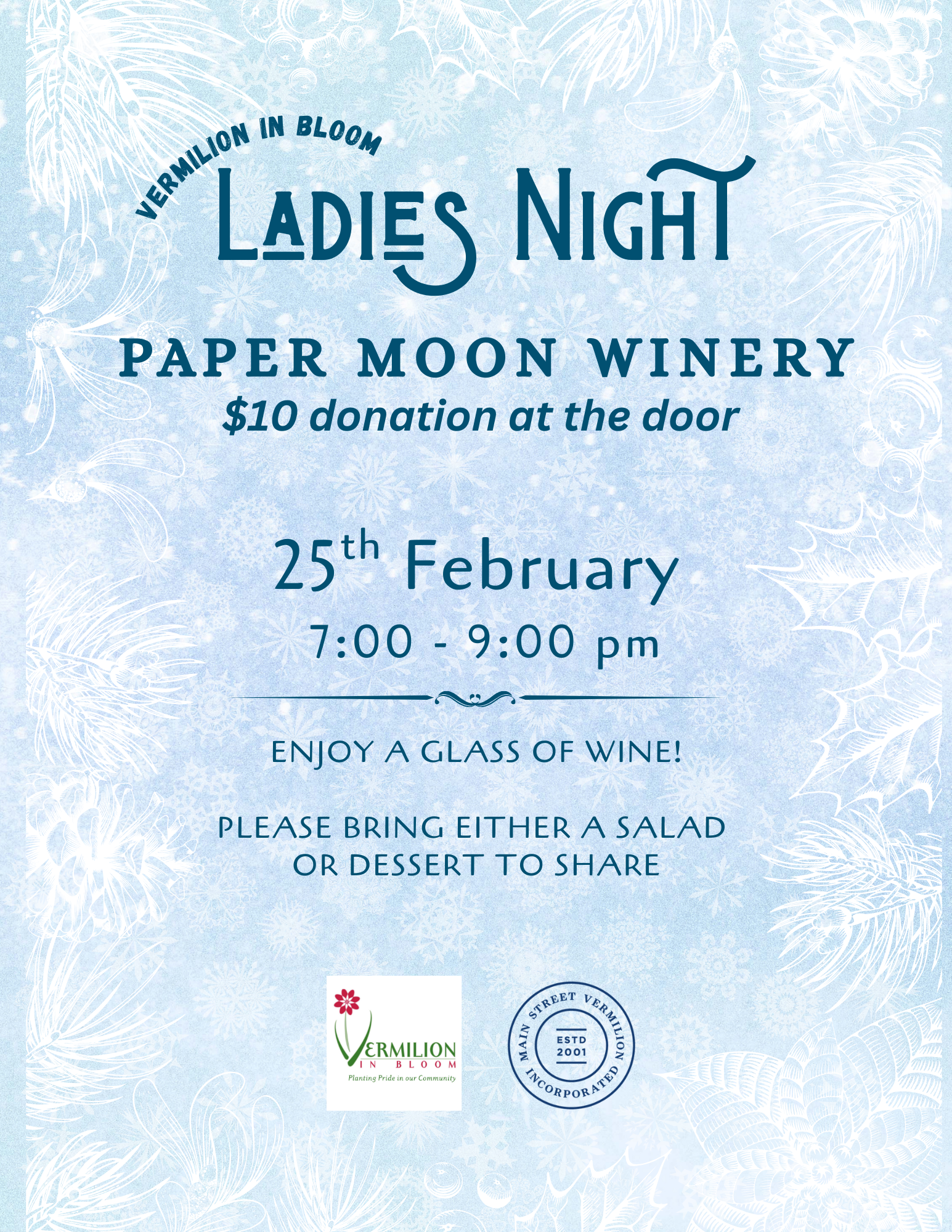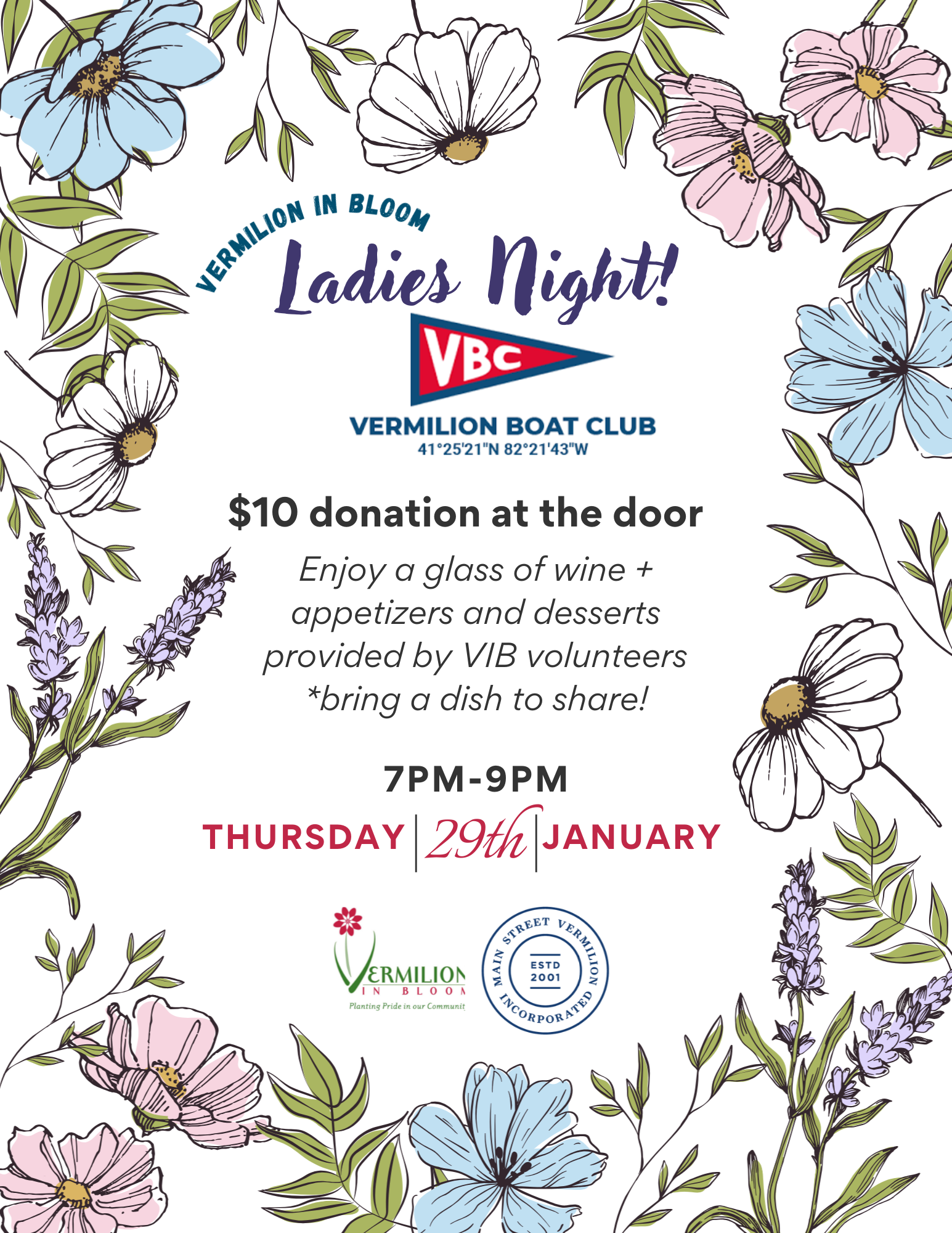 Every year, Vermilion in Bloom hosts popular ladies nights to get us through winter and into the planting season. Wine, food and lively conversation fill the evening. Everyone is welcome and you’re sure to meet new people, see some familiar faces and learn more about what Vermilion in Bloom does for Vermilion. A $10 donation at the door is requested. Join us as we toast to another season of Vermilion in Bloom!